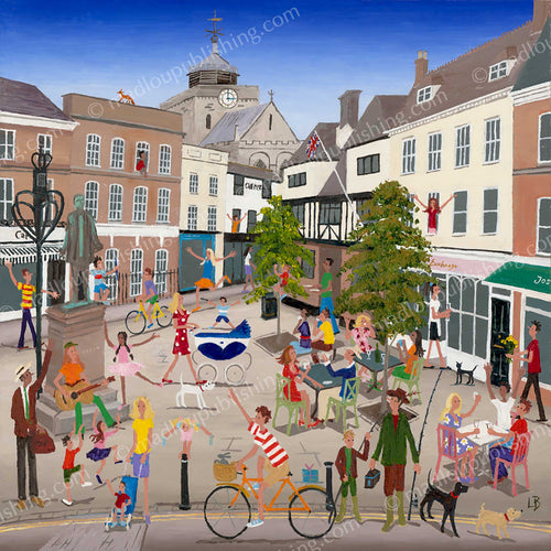 Her paintings are predominately figurative and painted in oils on board. She aims to capture the underlying essence of a crowded scene or an individual person in a stylised and naive fashion. Her paintings have been described as “happy Lowrys”.